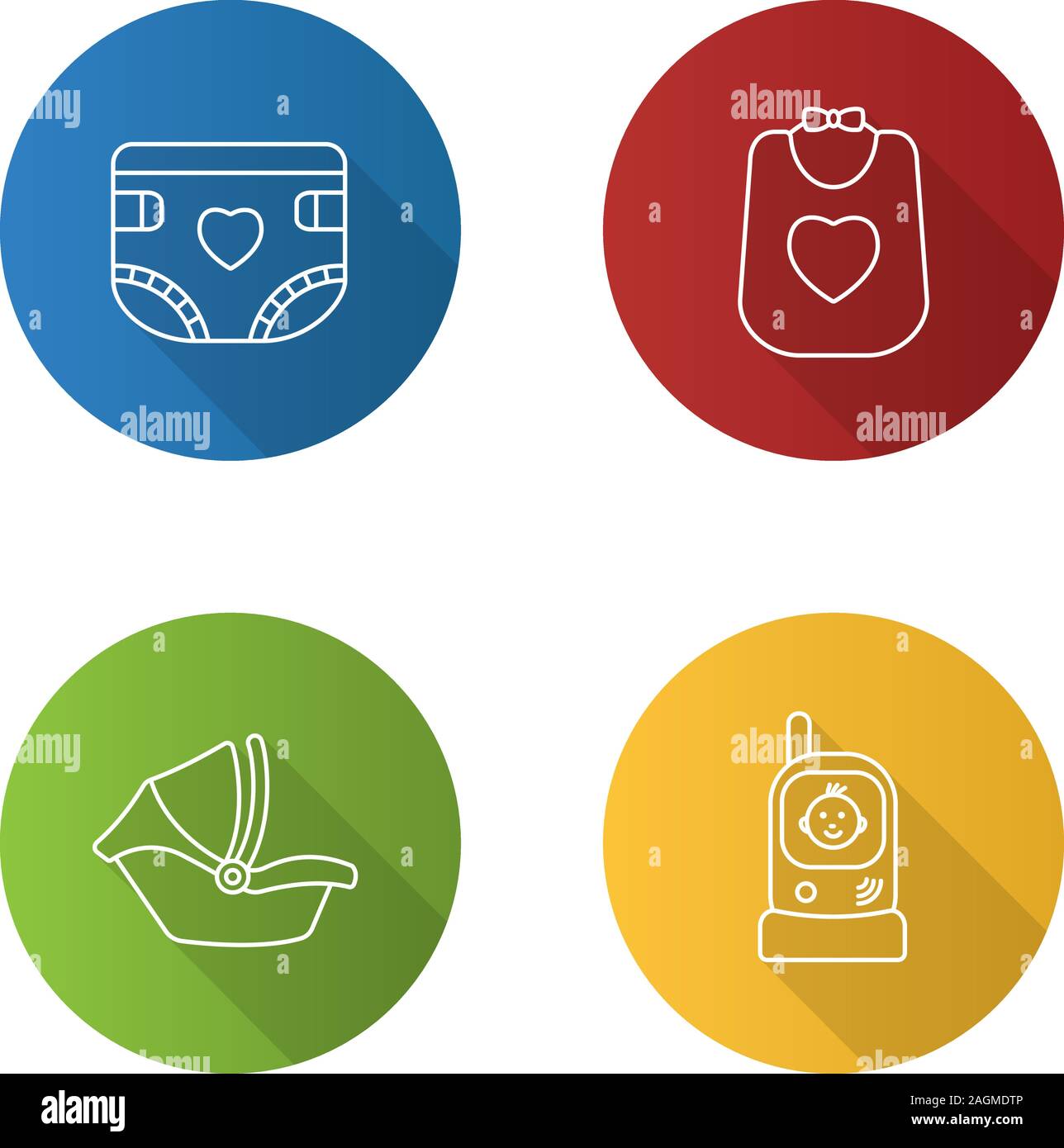 Childcare flat linear long shadow icons car seat bib