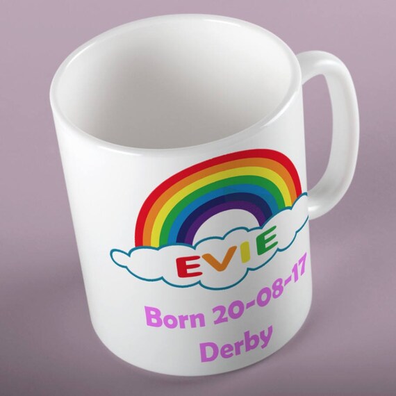 Personalised Baby Name Mug with Rainbow personalised baby cup